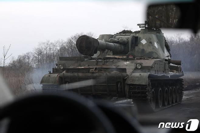 (바흐무트 AFP=뉴스1) 우동명 기자 = 17일(현지시간) 우크라이나 도네츠크 바흐무트에서 2S3 아카치야 자주 곡사포가 러시아 군을 향해 이동을 하고 있다.