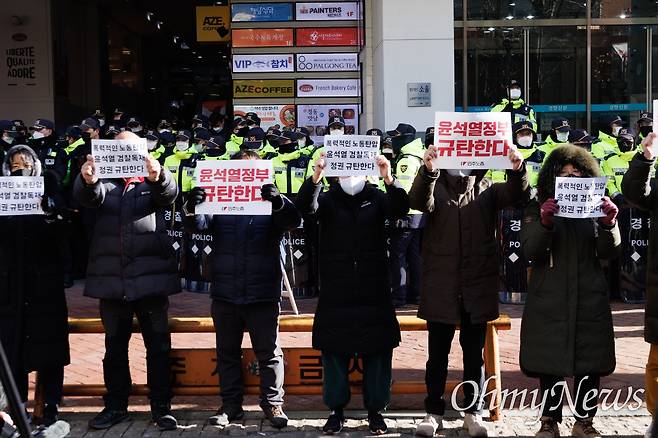 | ▲ 민주노총 조합원들이 18일 오전 서울 중구 민주노총사무실에서 국가보안법관련 혐의의 한 노조간부를 국정원이 압수수색하자 규탄하는 구호를 외치고 있다. |