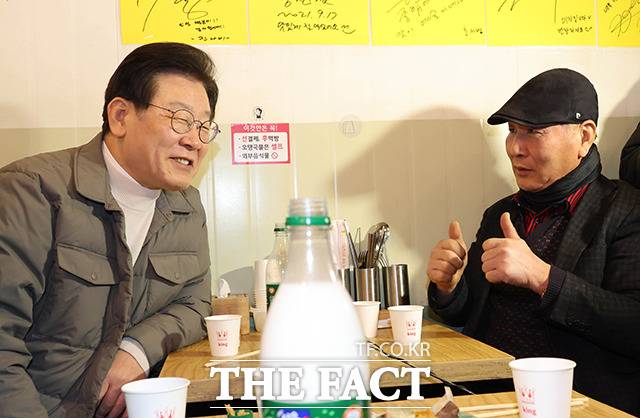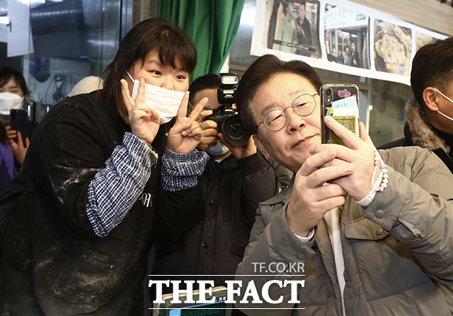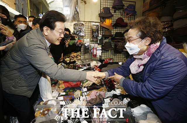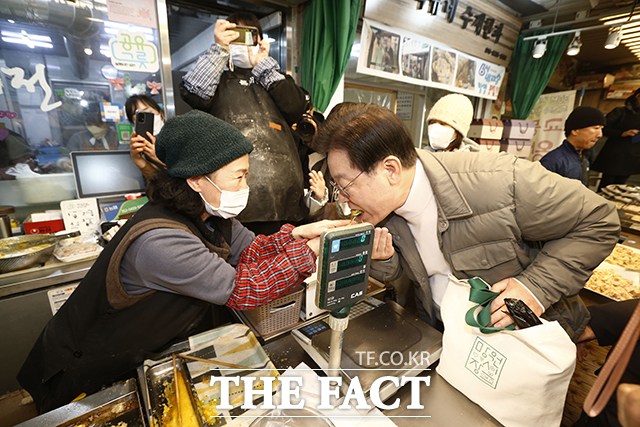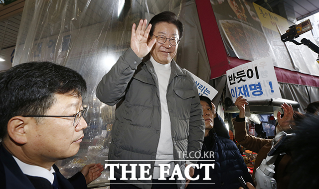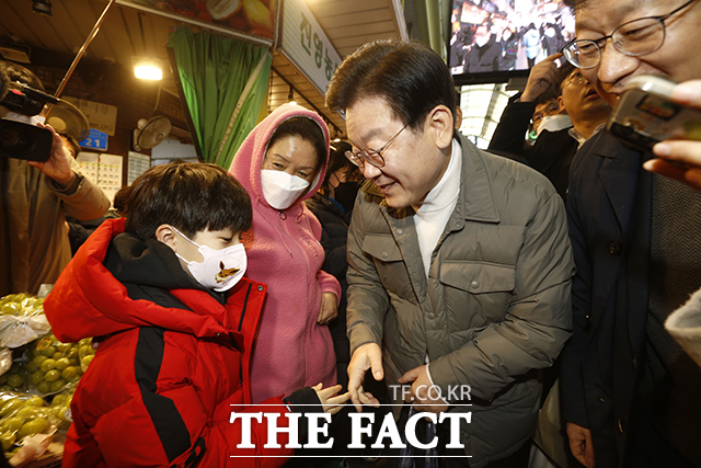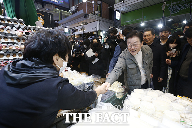 [더팩트ㅣ이동률 기자] 이재명 더불어민주당 대표가 18일 오후 서울 마포구 망원시장을 방문해 상인들과 인사를 나누고 있다.