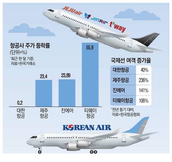 해외 여행 수요가 회복되면서 그간 억눌렸던 저비용항공사(LCC) 주가가 상승세를 보이고 있다. 반면 대한항공 주가는 제자리걸음을 하고 있다.