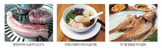 ◇소금구이 = 두툼한 고기를 썰어 굵은 소금을 뿌리고 그대로 구워 먹는 근고기는 글자 그대로 고깃덩이째 판매한다는 뜻이다. 고양시 삼송지구에서 오랜 세월 영업해온 연탄부락은 오겹살과 목살을 정말 어른 주먹 만하게 썰어 내는 근고기를 비롯해 생오겹살, 생삼겹살, 항정살 등이 맛있는 곳이다. 정말 한 근(600g)이다. 연탄불에 올려 이리저리 돌려가며 구워내면 짭조름한 소금기가 배어들어 한층 풍미가 좋아진다. 육즙을 가득 품은 고기도 좋고 계란찜, 추억의 도시락 등 곁들임도 맛있다. 경기 고양시 덕양구 삼송로193번길 14. 4만5000원.