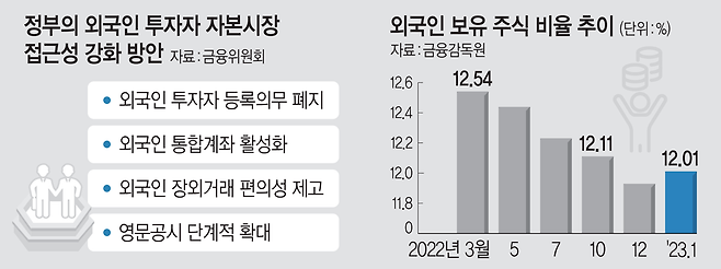 외국인 투자자 등록제가 폐지되면 외국인 투자자는 국제적으로 통용되는 개인 여권번호와 법인식별기호(LEI·법인에 부여되는 표준화된 ID) 등을 이용해 투자할 수 있게 된다. 현재 국내 상장 증권에 투자하려는 외국인은 금융당국에 인적 사항 등을 사전에 등록해야 했다. 또 내년부터 자산 10조 원 이상 상장법인의 중요 정보에 대해서는 단계적으로 영문공시를 확대하기로 했다. 글로벌 투자자들의 정보 접근성을 강화하기 위해서다. 외국인 통합계좌(다수 투자자의 매매를 단일 계좌에서 통합 처리할 목적으로 글로벌 운용사 명의로 개설된 계좌)를 활성화하기 위해 결제 즉시 투자 내역 보고 의무를 폐지한다. 시장 모니터링 등 필요시에만 세부 투자 내역을 요구할 예정이다.