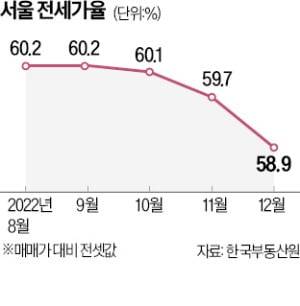 서울 아파트 전셋값이 빠르게 떨어지면서 전세가율(매매 가격 대비 전세 가격 비율)이 최근 60%를 밑돌고 있다.