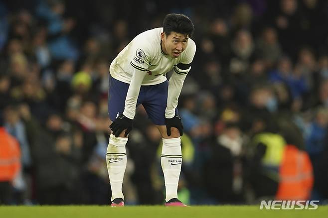 [맨체스터=AP/뉴시스] 토트넘 홋스퍼의 손흥민이 19일(현지시간) 영국 맨체스터의 에티하드 스타디움에서 열린 2022~23시즌 잉글랜드 프리미어리그 맨체스터 시티와의 7라운드 순연 경기 후반 45분 팀의 네 번째 골을 허용한 후 허탈해하고 있다. 손흥민은 풀타임을 소화하며 공격 포인트를 올리지 못했고 팀은 2-4로 역전패했다. 2023.01.20.