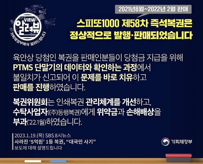 [사실은 이렇습니다] 기재부 “스피또1000 제58차 즉석복권, 정상적으로 발행·판매”