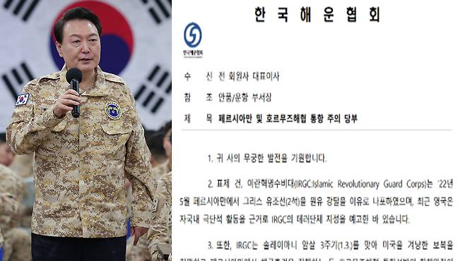 한국해운협회가 중동의 호르무즈 해협을 통항하는 회원사에 주의를 당부하는 공문을 보냈다. 윤석열 대통령의 'UAE의 적은 이란' 발언 이후 이란 정부가 한국대사를 초치하는 등 강력히 항의하는 상황이기 때문이다.