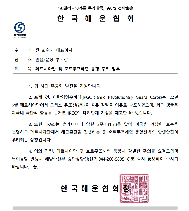 한국해운협회가 중동의 호르무즈 해협을 통항하는 회원사에 주의를 당부하는 공문을 보냈다.
