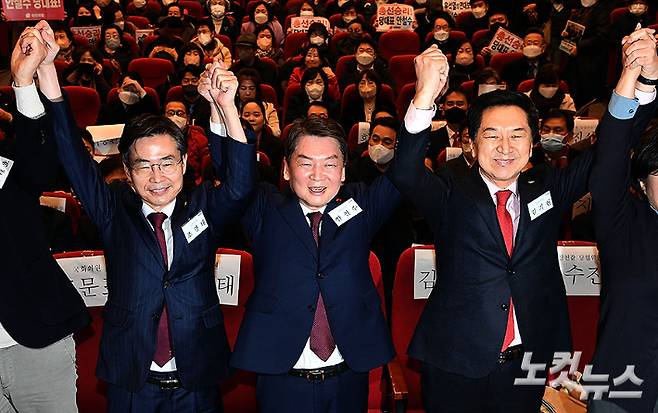 국민의힘 당권 경쟁에 뛰어든 조경태, 안철수, 김기현 의원(왼쪽부터)이 15일 오후 서울 양천구 해누리타운에서 열린 국민의힘 서울 양천갑 당원대회에 참석해 포즈를 취하고 있다. 황진환 기자