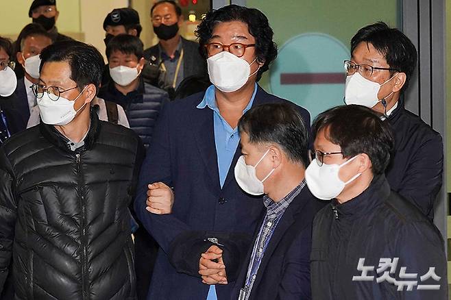 더불어민주당 이재명 대표의 '변호사비 대납 의혹' 핵심 인물인 김성태 전 쌍방울그룹 회장이 해외 도피 8개월 만인 17일 오전 인천공항 1터미널로 송환, 수원지검으로 압송되고 있다. 인천공항=황진환 기자