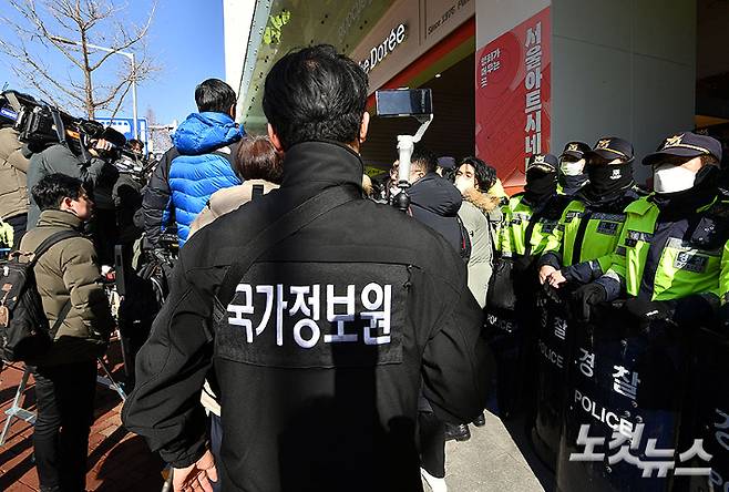 국가정보원과 경찰이 '간첩단 사건'과 관련, 민주노총에 대한 압수수색에 착수한 18일 오후 서울 중구 민주노총 사무실 앞에서 국정원 관계자가 민주노총 한상진 대변인의 브리핑을 촬영하고 있다. 황진환 기자