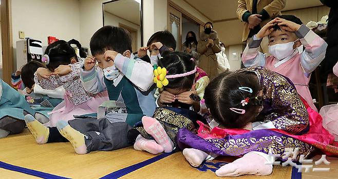 설 연휴를 앞둔 17일 오전 서울 송파구 문정 래미안 파크 경로당에서 삼성아트 어린이집 원생들이 한복을 차려입고 합동 세배를 하고 있다. 류영주 기자