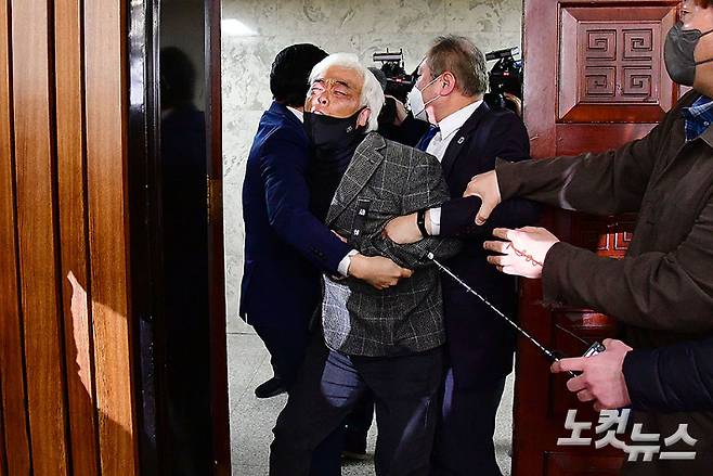 17일 서울 여의도 국회에서 열린 용산 이태원 참사 진상규명과 재발방지를 위한 국정조사특별위원회에서 이종철 10·29 이태원 참사 유가족협의회 대표가 국민의힘 의원들의 발언에 항의하다 제지당하고 있다. 이날 국민의힘 조수진 의원은 "청담동 술자리 의혹이 사실이냐. 사실이 아닌 게 명확한데도 사실이 아닌 것을 병기하는 것은 국민 분열을 가중시키겠다는 것"이라고 말했다. 조 의원의 이 같은 발언에 야당 의원들은 "관련 있는 것만 질문하시라"며 반발했고 방청하던 유가족들도 "청담동 술자리가 보고서 채택과 무슨 상관이냐"고 오열하며 실신하기도 했다. 윤창원 기자