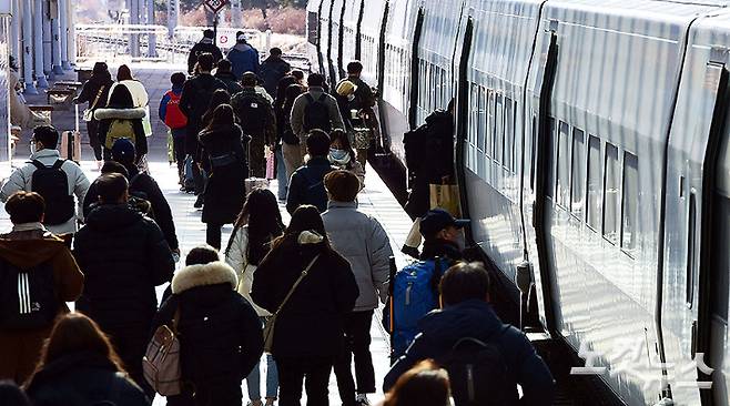 설 연휴를 하루 앞둔 20일 서울 용산구 서울역 승강장이 시민들과 고향으로 향하는 귀성객들로 붐비고 있다. 윤창원 기자