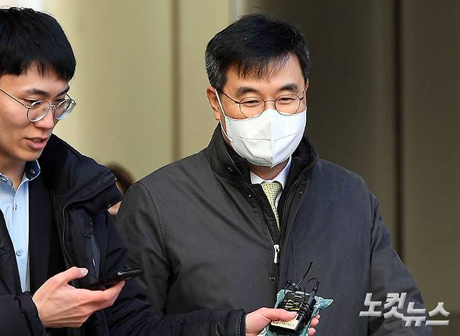 성추행 피해 끝에 스스로 목숨을 끊은 고 이예람 중사 사건을 수사한 군 검사에게 부당한 위력을 행사한 혐의로 불구속 기소된 전익수 전 공군 법무실장이 16일 오후 서울 서초구 중앙지법에서 열린 첫 공판에 출석하고 있다. 황진환 기자