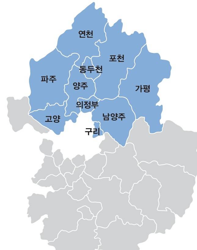 경기 북부는 경기도 31개 시군 가운데 한강 북쪽에 있는 구리·남양주·의정부·양주·포천·파주·동두천·가평·연천·고양 등 10개 시군이 해당합니다. 경기도·경기도교육청 북부청, 법원과 검찰, 경찰, 소방 등 주요 기관도 따로 갖추고 있습니다.