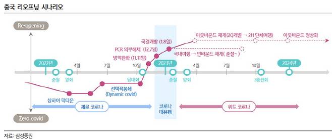 중국 리오프닝 정책 기대감은 이미 주가에 반영됐다는 평이다. 앞으로는 경제와 산업에 미치는 펀더멘털 변화에 따라 주가 차별화된 흐름이 나타날 전망이다. 삼성증권은 △올 상반기 최대 수혜 업종으로 화장품(화장품 전반 상승)·유통(중국 보따리상 재고 확보), 미디어·엔터테인먼트(고연 재개와 한한령 해제 이슈), 게임(한국산 수입 재개 예상), 바이오·헬스케어(위드 코로나 초기 제약 수요)를 꼽고 ‘긍정적’이란 투자 의견을 제시했다.