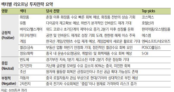 긍정적 투자의견의 섹터별 관련주는 코스맥스(192820), 호텔신라(008770), 한미약품(128940), 오스템임플란트(048260), 에스엠(041510), 엔씨소프트(036570), 네오위즈(095660), POSCO홀딩스(005490), S-Oil 등이다.