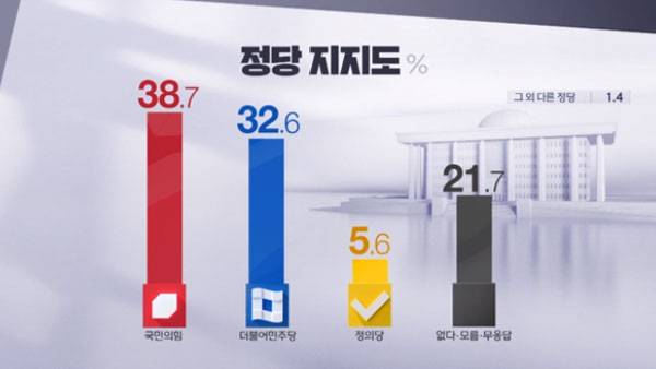 정당 지지도는 국민의힘 38.7%, 더불어민주당 32.6%, 정의당 5.6%로 조사됐습니다.