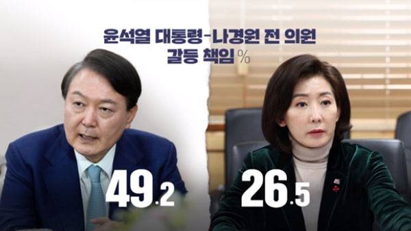 누구 책임이 더 크냐는 질문에 윤석열 대통령 책임이 더 크다는 답이 49.2%로, 나경원 전 의원 책임이 더 크다는 답 26.5%의 두 배에 달했습니다.