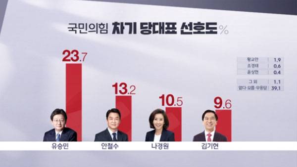 유승민 전 의원이 23.7%로 가장 높았고, 안철수 의원 13.2%, 나경원 10.5%, 김기현 9.6%였습니다.