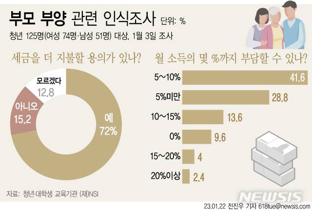 노인 돌봄을 국가가 책임져 준다면 세금을 더 낼 수 있느냐는 질문에는 72%가 동의했고 15.2%는 반대했다. 12.8%는 '모르겠다'를 선택했다.