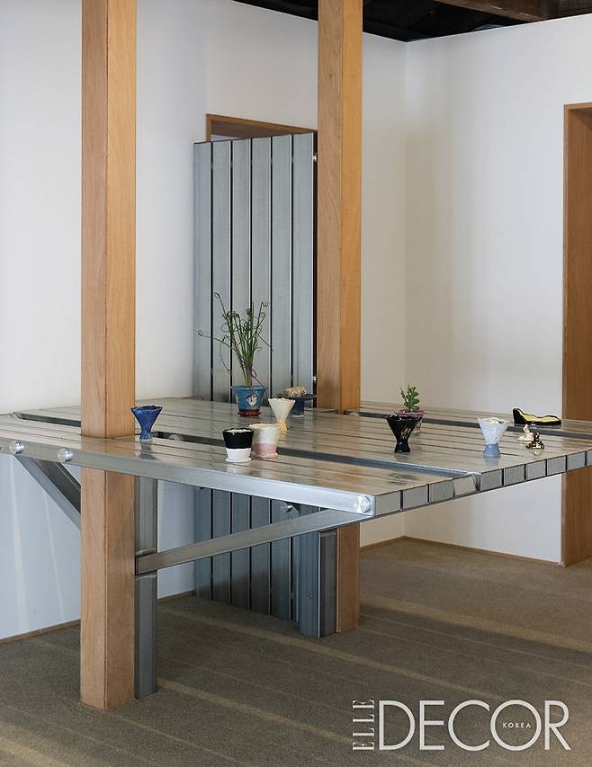 가구와 인테리어 단계에서 사용할 수 있는 금속 소재는 기본적으로 얇은 판재 형태다. 따라서 단단한 형태로 만들 때 판재를 종이접기하듯 구부리고 접어야 한다. 하지만 우리는 기능적으로 필요한 게 아니라면 대체로 원재료인 금속의 얇고 날렵한 느낌을 그대로 드러내고자 한다.