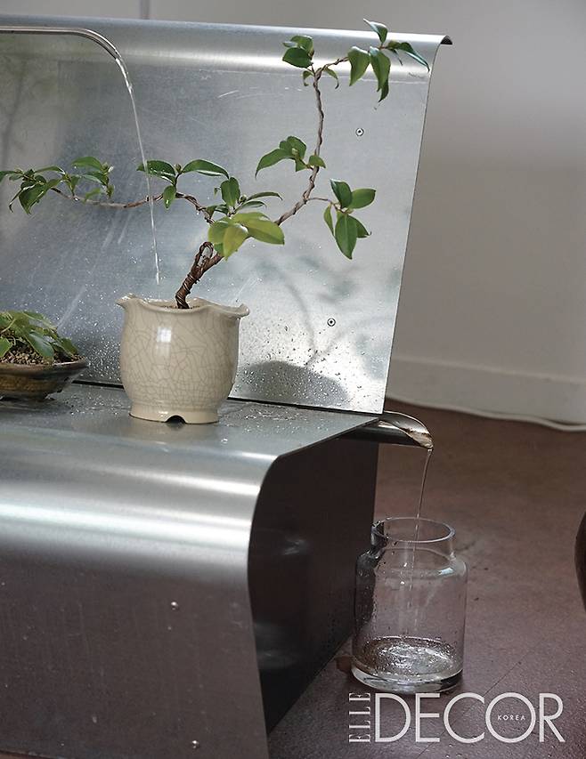 금속은 시각적 · 촉각적으로 차갑게 느껴진다. 그래서 오히려 따뜻한 소재와 배치했을 때 전달되는 묘한 느낌이 매력적이다. 또 작은 크기라도 정교하게 가공할 수 있는 점도 좋아한다. 해방촌에 있는 식물 편집 숍 4T는 주거공간처럼 느껴졌으면 좋겠다는 클라이언트의 요청에 집에서 쓰는 익숙한 가구를 식물을 위한 형태로 재구성했다. 케틀 카우치는 식물에 물을 바로 줄 수 있는 소파다. 식물 위에 소파를 앉혀 놓고 물을 주면 화분에서 흘러나온 물이 뒤로 모이고, 기다란 관을 따라 양쪽으로 모여 내려간다.