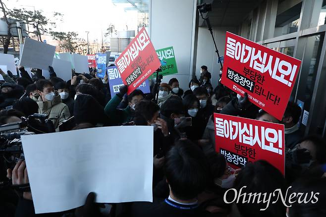 | ▲ 윤석열 대선 후보 배우자 김건희씨의 '7시간 통화 녹취록'을 보도 예고한 MBC를 항의 방문한 국민의힘 김기현 원내대표와 의원들이 2022년 1월 14일 오전 서울 마포구 상암동 MBC 사옥 앞에서 MBC노조원들의 반대에 막혀 있다. |