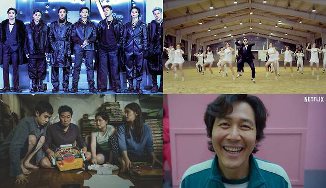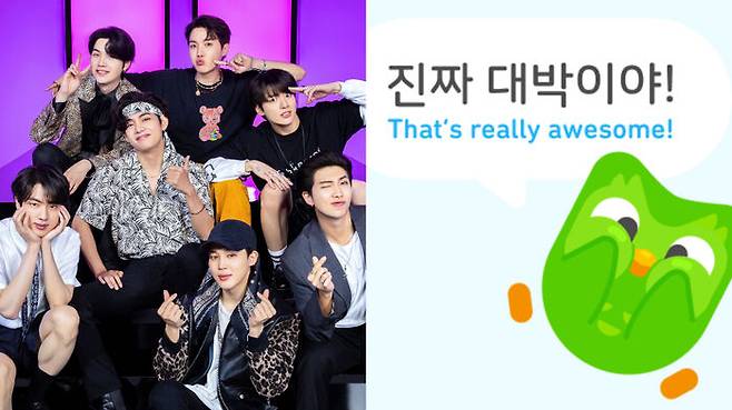 (사진=듀오링고 공식 블로그, BTS 트위터, 유튜브 'officialpsy', 영화 '기생충'·드라마 '오징어게임' 스틸컷)