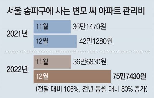 서울 송파구의 30평대 초반 아파트에 사는 변모 씨(44)는 “최근 지난해 12월분 관리비 고지서를 받았는데 처음엔 뭔가 잘못된 줄 알았다”며 “전달(36만6830원)의 2배 이상이라 관리실에 문의했더니 난방비가 올라 다들 난리라고 하더라”고 말했다. 관리비는 전년 동월 대비로도 80%가량 올랐다.