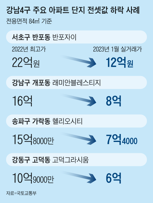 올해 들어 서울 강남 4구(강남·서초·송파·강동) 주요 아파트 단지에서는 작년 최고가에 비해 40~50%씩 떨어진 가격에 전세 계약이 체결되는 사례가 잇따르고 있다. 서초구 반포동 ‘반포자이’ 84㎡는 작년 5월 22억원에 거래됐지만, 이달엔 12억원에 계약서를 썼다. 송파구 가락동 ‘헬리오시티’도 같은 면적 전세 거래가가 작년 3월 15억8000만원에서 이달 8억원으로 49% 떨어졌다.