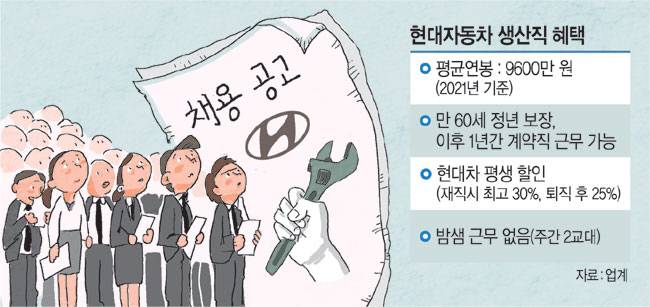 정부·지방자치단체·공기업 직원까지 이직에 관심을 보이는 것은 현대차 생산직의 연봉과 복지 혜택 등이 파격적인 수준이기 때문이다. 평균 연봉이 1억 원에 육박할 뿐만 아니라 퇴직 후에도 평생 현대차 구입 시 25%의 할인 혜택을 받을 수 있다. 만 60세 정년 이후에도 1년간 계약직으로 더 일할 수 있다. 삼성, SK, LG 등 대기업 사무직들조차 “학력을 하향 조정해서라도 현대차에 가고 싶다”고 말할 정도다. 경기 둔화로 일자리 감소가 우려되면서 올해 현대차 생산직 경쟁률은 지난 2021년 기아가 생산직 채용 당시 기록한 500대 1을 뛰어넘을 것이란 관측까지 나온다.