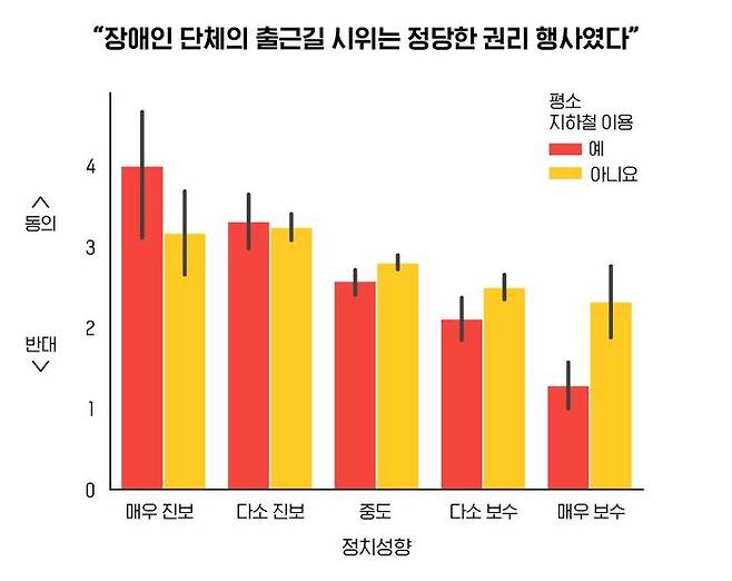 이런 경향은 위 그래프처럼 본인의 정치 성향을 '매우 진보(1점)'부터 '매우 보수(5점)' 사이에서 응답하게 했을 때에도 일관되게 나타났습니다. (p<.01) 스스로가 매우 진보적이라고 응답한 사람들은 지하철을 이용할수록 시위에 우호적이었지만, 그래프의 오른쪽 막대들로 이동할수록, 즉 정치 성향이 보수적일수록 지하철 이용 경험이 시위 여론에 부정적인 영향을 주었죠.