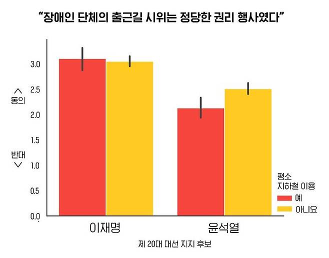 각 후보 지지자마다 지하철 이용 여부에 따라 서로 다른 패턴이 나타난다는 것을 알 수 있습니다. 이재명 후보에 투표한 응답자들은 평소 지하철 이용 여부와 전장연 시위에 대한 의견이 무관했지만, 윤석열 후보에 투표한 응답자들은 평소 지하철을 이용할수록 시위에 대한 비판 여론이 더 심했습니다. (p<.0 5)