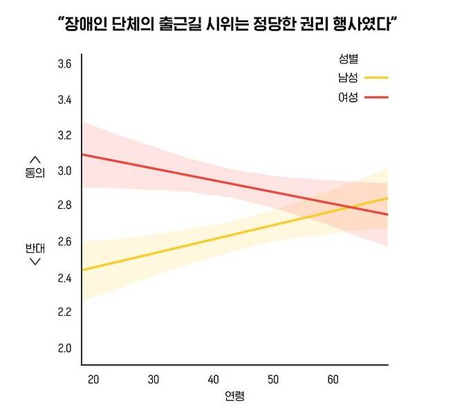 경기도민은 서울까지 긴 통근·통학 시간을 겪는 경우가 많기에 그 피해가 응답에 반영되었다고 볼 수 있겠지만, 직접 시위에 영향을 받는 서울시민에게는 정작 그러한 경향이 전혀 없었다는 점, 또 반대로 시위 영향권에 전혀 포함되지 않는 비수도권 시민들에게 오히려 약하게나마 상관관계가 관찰된 점을 고려하면, 분명 직접적인 불편함 이외의 심리적인 무언가가 전장연 시위 여론에 영향을 주었을 것도 같습니다.