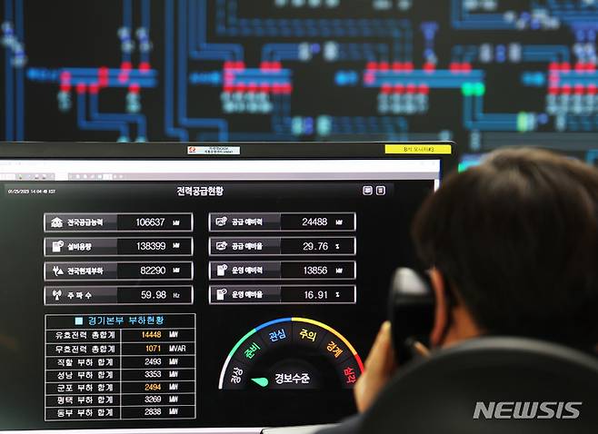 [수원=뉴시스] 김종택 기자 = 전국적으로 한파가 이어지고 있는 25일 경기도 수원시 영통구 한국전력공사 경기지역본부 전력관리처 계통운영센터에서 관계자들이 전력수급현황을 점검하고 있다. 2023.01.25. jtk@newsis.com