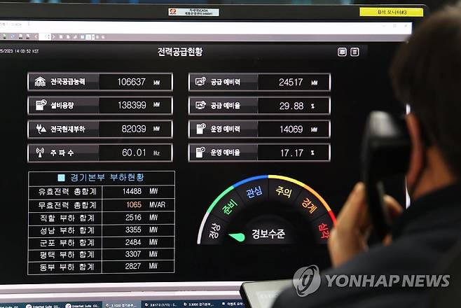 (수원=연합뉴스) 홍기원 기자 = 북극 한파에 전력 수요가 증가하고 있는 25일 오후 경기도 수원시 한국전력공사 경기지역본부 전력관리처 계통운영센터에서 관계자들이 전력수급상황을 점검하고 있다. 2023.1.25