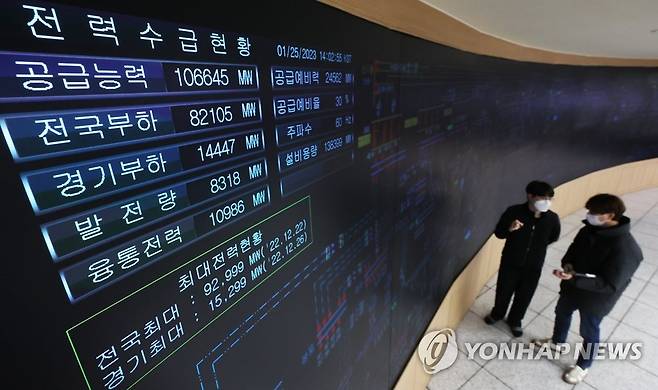 (수원=연합뉴스) 홍기원 기자 = 북극 한파에 전력 수요가 증가하고 있는 25일 오후 경기도 수원시 한국전력공사 경기지역본부 전력관리처 계통운영센터에서 관계자들이 전력수급상황을 점검하고 있다. 2023.1.25