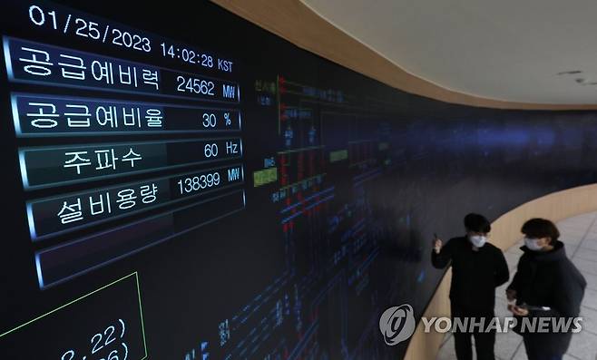 (수원=연합뉴스) 홍기원 기자 = 북극 한파에 전력 수요가 증가하고 있는 25일 오후 경기도 수원시 한국전력공사 경기지역본부 전력관리처 계통운영센터에서 관계자들이 전력수급상황을 점검하고 있다. 2023.1.25