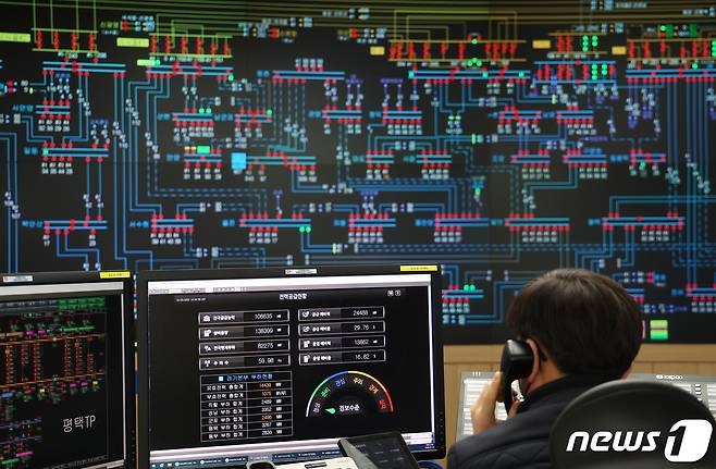 (수원=뉴스1) 김영운 기자 = 강력한 한파로 인해 전력 수요가 급증하고 있는 25일 오후 경기 수원시 영통구 한국전력공사 경기지역본부 전력관리처 계통운영센터에서 관계자들이 전력 수급 상황을 점검하고 있다. (공동취재) 2023.1.25/뉴스1