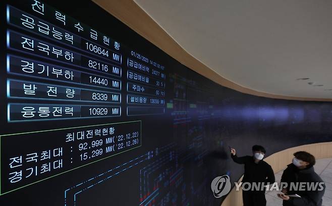 (수원=연합뉴스) 홍기원 기자 = 북극 한파에 전력 수요가 증가하고 있는 25일 오후 경기도 수원시 한국전력공사 경기지역본부 전력관리처 계통운영센터에서 관계자들이 전력수급상황을 점검하고 있다. 2023.1.25
