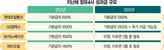 한편 현대오일뱅크는 지난해 성과급으로 전년보다 400%p 늘어난 전직원 기본급의 1000%를 지급했다.