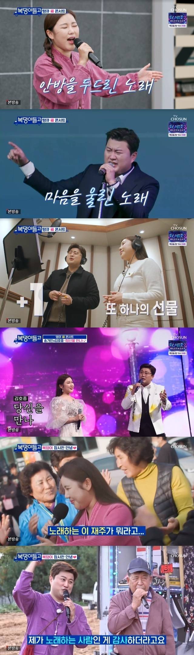 1월 25일 방송된 TV조선 예능 '복덩이들고(GO)'(이하 '복덩이들고') 12회에서는 복덩이 남매 송가인, 김호중, 허경환의 복 나눔 여정 마지막을 장식할 복(福) 콘서트가 개최됐다.