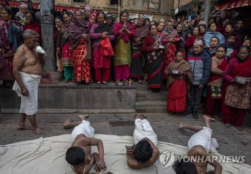 epa10430283 Nepalese Hindu devotees roll on the ground during the month long Madhav Narayan festival in Bhaktapur, Nepal, 26 January 2023. The Madhav Narayan festival takes place for a full month and is devoted to religious fasting, holy bathing and the study of the Swasthani book, a chapter or story of which is read each evening by priests or heads of households to the gathered family. Thousands of married women and dozens of male devotees concluded their month-long fast for a better life and peace in the country at various temples. According the Swasthani book, whoever takes the month long Swasthani fast, all their sins will be forgiven and they will not experience bad days during their life. The festival is dedicated to Lord Shiva, the god of creation and destruction. EPA/NARENDRA SHRESTHA