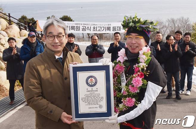 (서울=뉴스1) = ‘괴짜왕’ 조웅래(64) 맥키스컴퍼니 회장이 26일 하루 평균 마라톤 풀코스(42.195㎞) 이상을 두발로 달리는 방식으로 ‘대한민국 한 바퀴 5,228㎞’를 국내 최초·최단시간 완주한 후 한국기록원 인증서를 받고 있다.