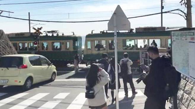 일본 가나가와현 가마쿠라시의 한 철길 건널목.