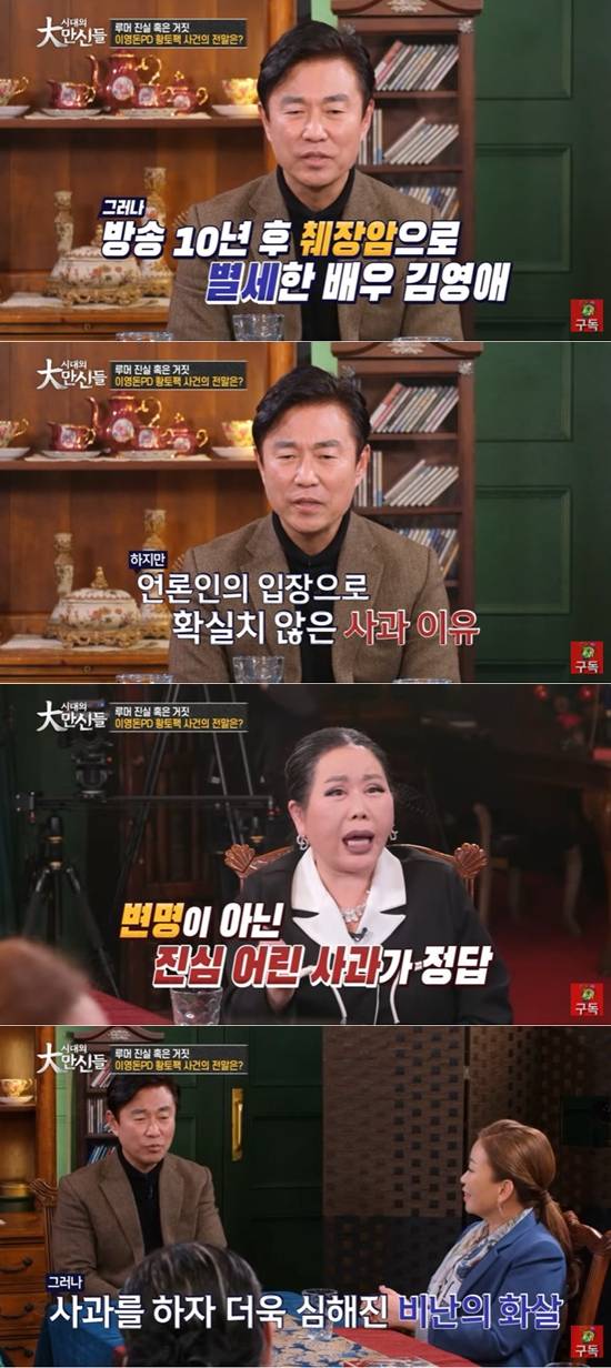 이영돈 PD가 故 김영애의 죽음과 관련돼 논란이 된 '황토팩 사건'과 '대왕 카스테라 사건'에 억울함을 드러냈다.