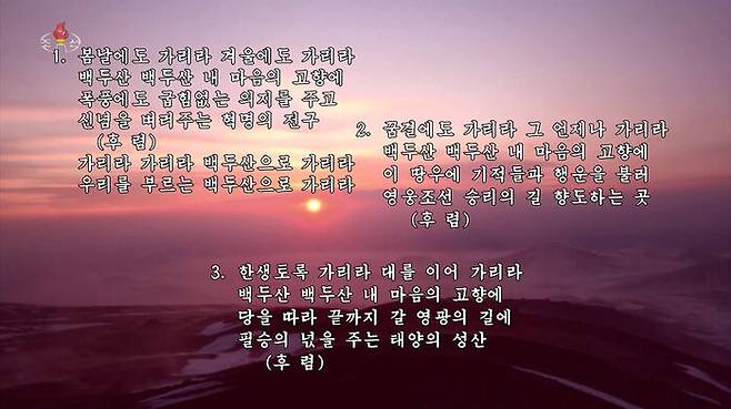 ['가리라 백두산으로' (북한 선전가요) : 봄날에도 가리라 겨울에도 가리라 백두산 백두산 내 마음의 고향에.]