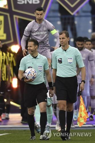 epa10431692 Al Nassr's Cristiano Ronaldo (back) jumps to warm up before the Saudi Super Cup soccer match between Al-Ittihad and Al-Nassr in Riyadh, Saudi Arabia, 26 January 2023. EPA/STR