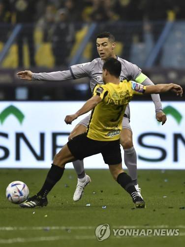 epa10431694 Al Nassr's Cristiano Ronaldo (back) in action against Al-Ittihad's Tarek Hamed during the Saudi Super Cup soccer match between Al-Ittihad and Al-Nassr in Riyadh, Saudi Arabia, 26 January 2023. EPA/STR
